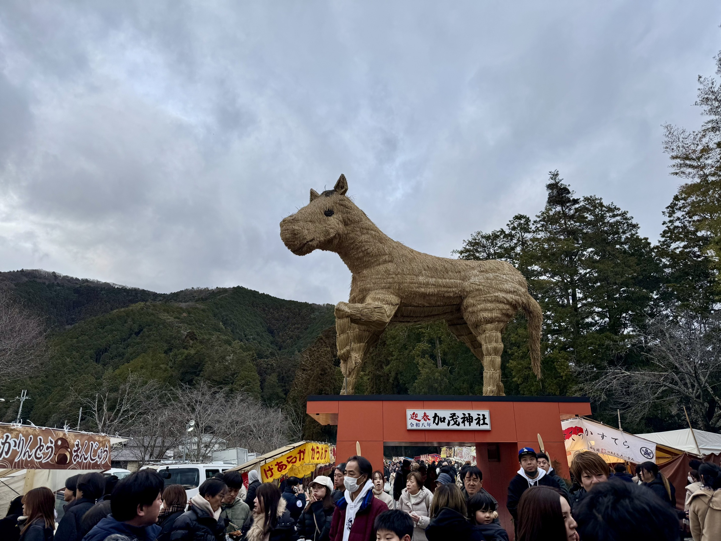 拝殿はまだだいぶ奥のようで、参道には露店が並んでいます。並ぶ木々も立派です。
